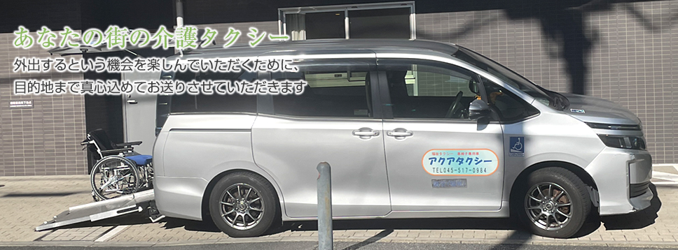この度は「アクアタクシー介護」のホームページにお越しいただき、誠にありがとうございます。アクアタクシーは福祉タクシーの会社です。ヘルパー資格取得ドライバーが、安全、安心をモットーにお客様をお運びいたします。